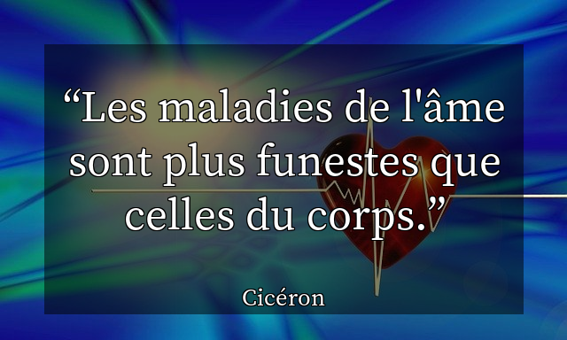 Citation Les maladies de l'âme sont plus funestes que celles du corps. En images ... Previous Next Cicéron Envoyez cette poésie à un ami × Infos - Le texte sera automatiquement ajouté à votre message Prénom Nom Votre email Email du destinataire Sujet Message Précédent Suivant Votes - - Commentaires Vous devez être connecté pour pouvoir écrire un commentaire Message Envoyer Publicité
