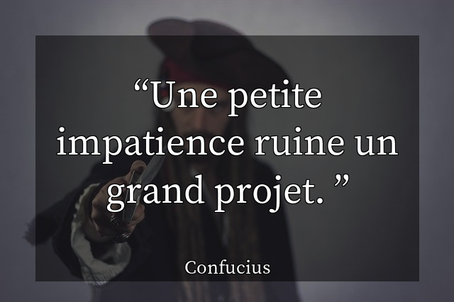 Citation Une petite impatience ruine un grand projet. En images ... Previous Next Confucius Envoyez cette poésie à un ami × Infos - Le texte sera automatiquement ajouté à votre message Prénom Nom Votre email Email du destinataire Sujet Message Précédent Suivant Votes - - Commentaires Vous devez être connecté pour pouvoir écrire un commentaire Message Envoyer Publicité